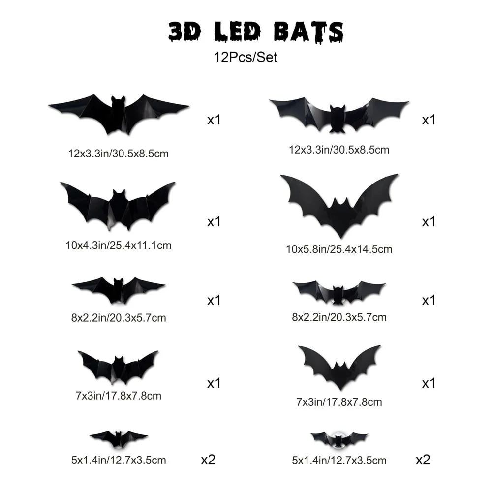The set includes sticky square tape: simply attach the adhesive to the back of the bat, affix the LED light, and place it where desired. The bats are removable without leaving residue and reusable, so you can store them for the next Halloween season.